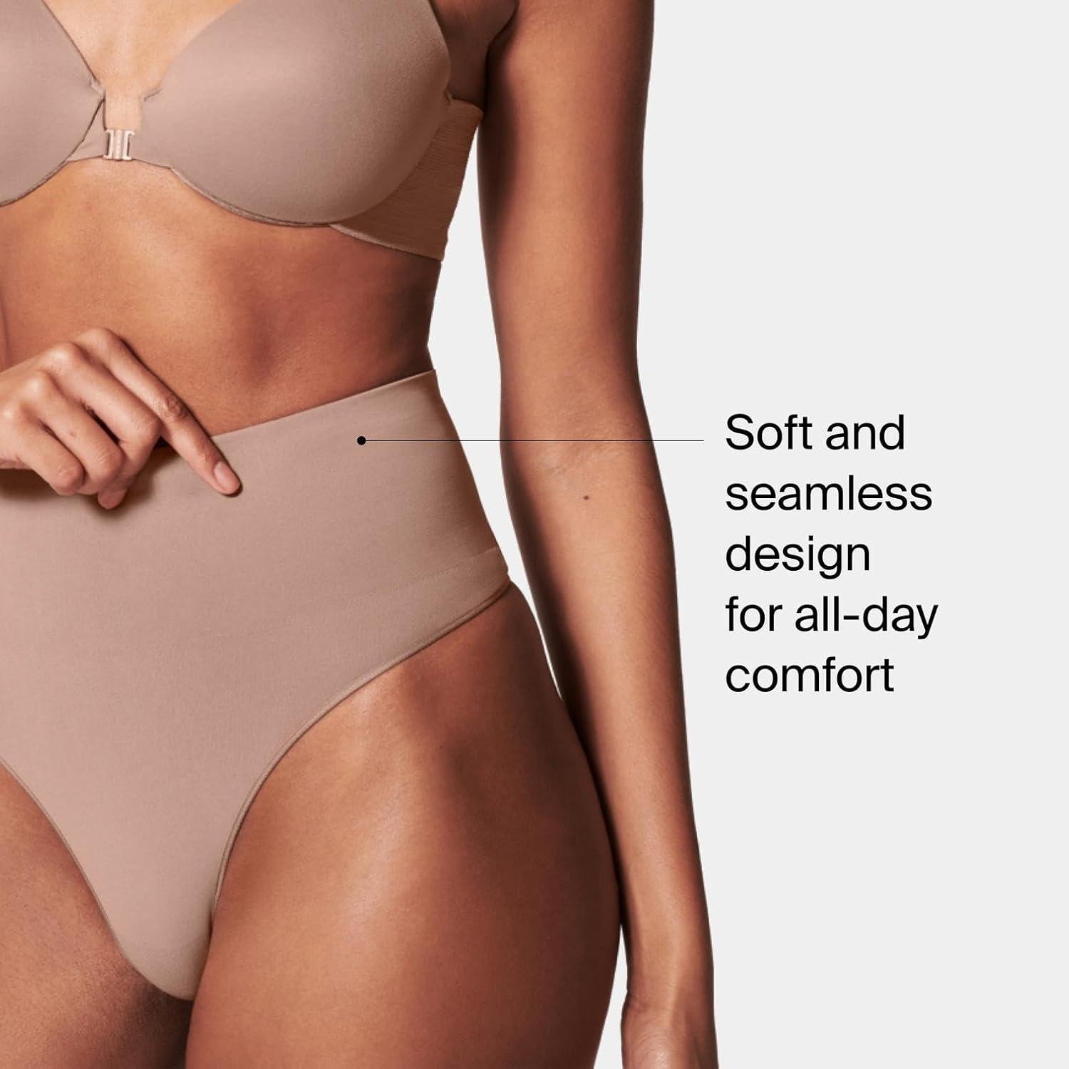 Meet the SPANXshape ExtraOrdinary Thong—your solution for a supported, smooth shape, all while championing earth-friendly materials. Made with SENSIL EcoCare recycled nylon yarns, this seamless style feels good and does good for the environment. This thong provides strong support with powerful compression. The result? A shapewear panty that's as good for the planet as it is for your silhouette. The SPANXshape ExtraOrdinary Thong has a seamless construction, giving you the confidence to wear this brief under your favorite outfits with no visible lines. The shaping waistband is designed to sculpt with strong support. This thong is made of 89% nylon, 10% elastane, and 1% cotton, ensuring this breathable underwear feels comfortable throughout the day.With a seamless shaping waistband that doesn't dig, the SPANXshape ExtraOrdinary Thong gives you comfortable support that's invisible under clothing. The flat leg opening ensures a distraction-free experience.This thong fits slightly small. Machine wash warm. Only non-chlorine bleach when needed. Tumble dry low. Do not iron or dry clean. Wear it and feel the difference as you go about your day, supported and comfortable. SPANX is a brand for women, by women. So, we understand what it feels like to be everything, to everyone, all at once—and needing clothes that can do the same. Our pieces are designed to effortlessly adapt to your busy lifestyle, ensuring you feel confident and comfortable—no matter the occasion. Because we firmly believe when you feel your best, you do your best.